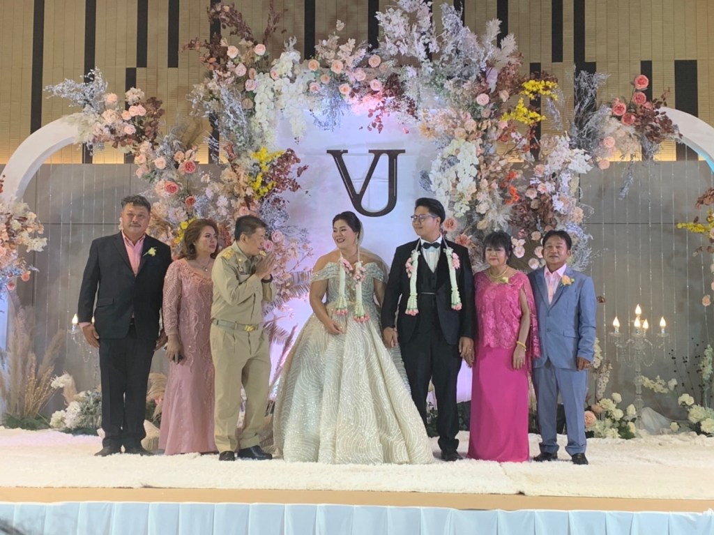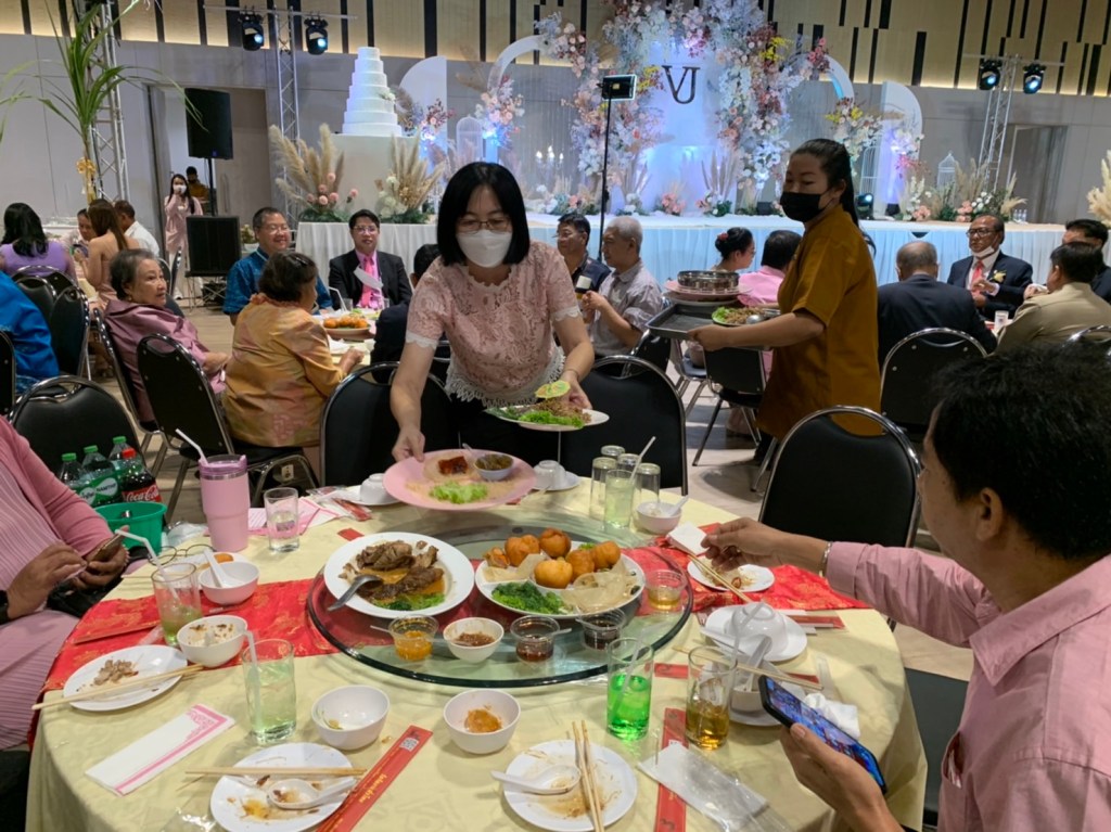 ที่เดินทางมาจากสถานที่ต่างๆ หลายท่าน ตนได้สั่งอาหารโต๊ะจีนซื่อดังจาก จ.นครปฐม คือ“ยุทธพงษ์โภชนา” ซึ่งเป็นโต๊ะจีนแนวหน้าจังหวัดนครปฐมมาเลี้ยงรับรอง แขกผู้มีเกียรติ  จำนวน 150 โต๊ะ เต็มพื้นที่ของสถานที่จัดงาน ตนทั้งสองต้องขอขอบคุณ ผู้ใหญ่ และญาติมิตรทุกท่าน ที่ให้เกียรติมาร่วมฉลองงาน มงคลสมรสของบุตรี ตนหากมีสิ่งผิดพลาดประการใดตนทั้งสองกราบขออภัย มา  ณ ที่นี้ด้วย