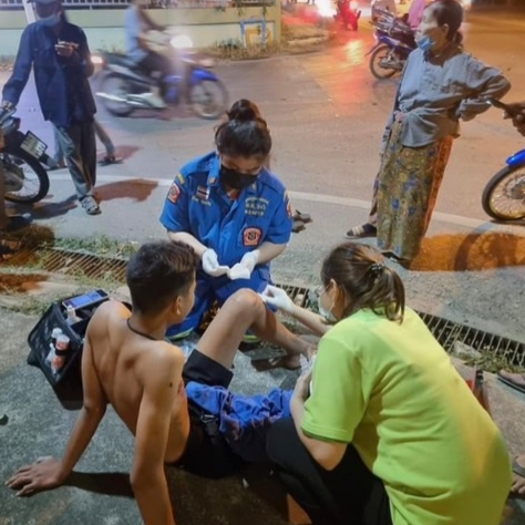 นางพัชรี เกษรบุญนาค รองผู้อำนวยการโรงพยาบาลสามพราน กำลังช่วยปฐมพยาบาลผู้ประสบเหตุ