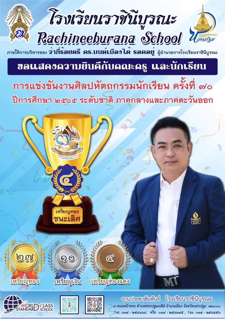 ปิดฉากลงเรียบร้อยแล้วสำหรับการแข่งขันงานศิลปหัตถกรรมนักเรียน ระดับชาติ ภาคกลางและภาคตะวันออก ปีการศึกษา2565 โดยจังหวัดราชบุรีเป็นเจ้าภาพจัดการแข่งขันระหว่างวันที่ 25-27มกราคม 2565ที่ผ่านมา ซึ่งโรงเรียนราชินีบูรณะ สำนักงานเขตพื้นที่การศึกษามัธยมศึกษานครปฐม มีนักเรียนที่ได้รับรางวัลชนะเลิศการแข่งขันระดับเขตพื้นที่การศึกษา และได้เป็นตัวแทนเข้าแข่งขันในระดับชาติ จำนวนทั้งสิ้น 48 รายการ