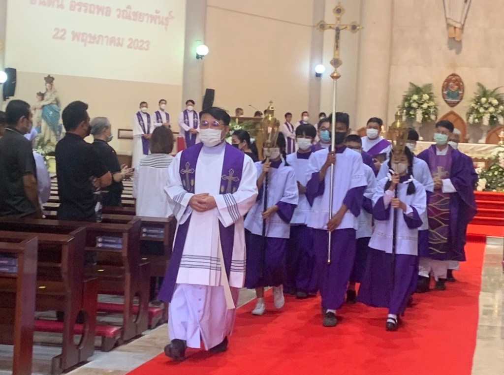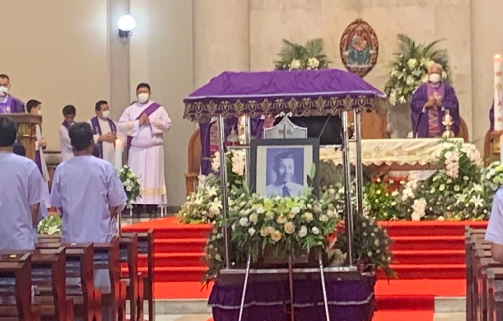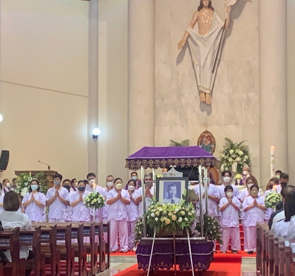 ในพิธีมิสซาศพในวันนี้ได้รับความเมตตา จากบาทหลวง บัณฑิต ประจงกิจ ซึ่งเป็นคุณพ่อ เจ้าวัดนักบุญเปโตร พร้อมคณะร่วมประกอบพิธี มิสซาโดยมี ผู้บริหารท้องถิ่น นักปกครอง ญาติมิตรร่วม พิธีมิสซาไว้อาลัย แบบอบอุ่นก่อนนำศพ ก๋งเล็กผ้าขาวม้า ไปบรรจุ ณ สุสานวัดนักบุญเปโตร อ.สามพราน จ. นครปฐม