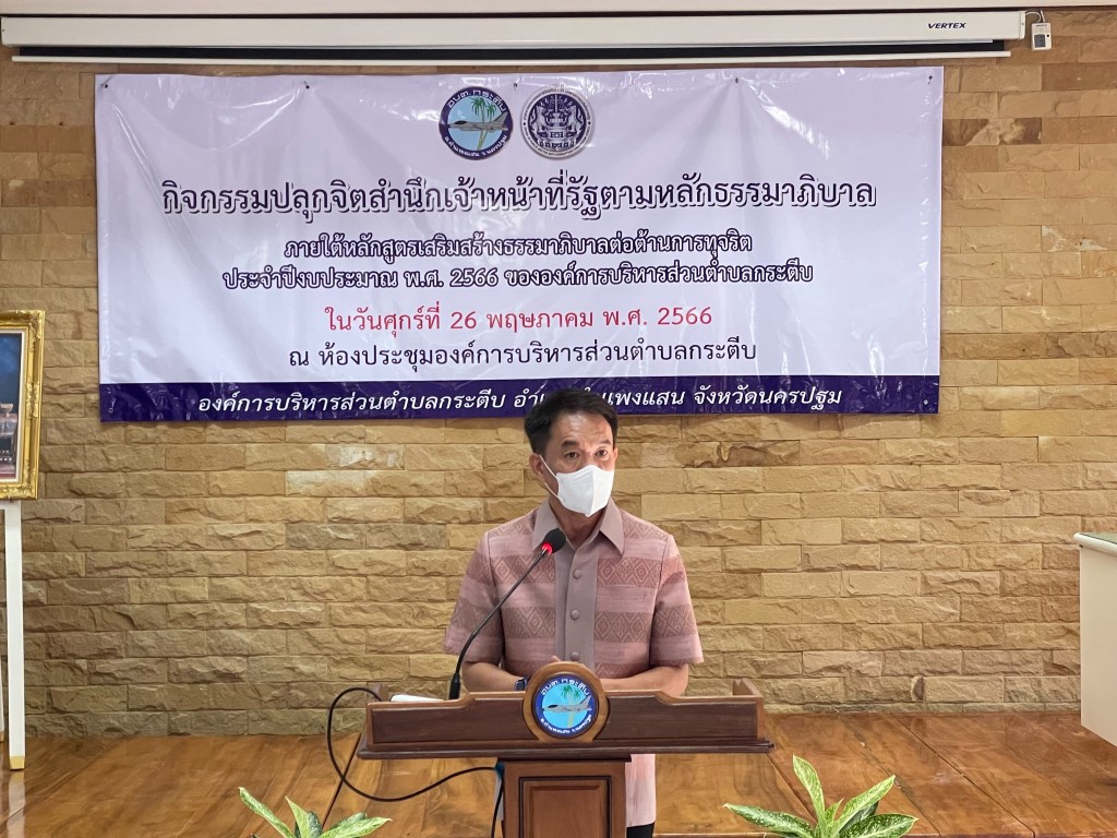 วันที่ 26 พฤษภาคม 2566 ที่ห้องประชุมองค์การบริหารส่วนตำบลกระตีบ อำเภอกำแพงแสน จังหวัดนครปฐม นายยงยุทธ สวนทอง รองผู้ว่าราชการจังหวัดนครปฐม เป็นประธานเปิดโครงการอบรมปลุกจิตสำนึกเจ้าหน้าที่รัฐตามหลักธรรมาภิบาล ภายใต้หลักสูตรเสริมสร้างธรรมาภิบาล ต่อต้านการทุจริตประจำปี 2566 โดยมี ผู้บัญชาการโรงเรียนการบิน นายอำเภอกำแพงแสน ผู้บริหารองค์กรปกครองส่วนท้องถิ่น ผู้บริหารสถานศึกษา ส่วนราชการ และเจ้าหน้าที่ ร่วมโครงการในครั้งนี้