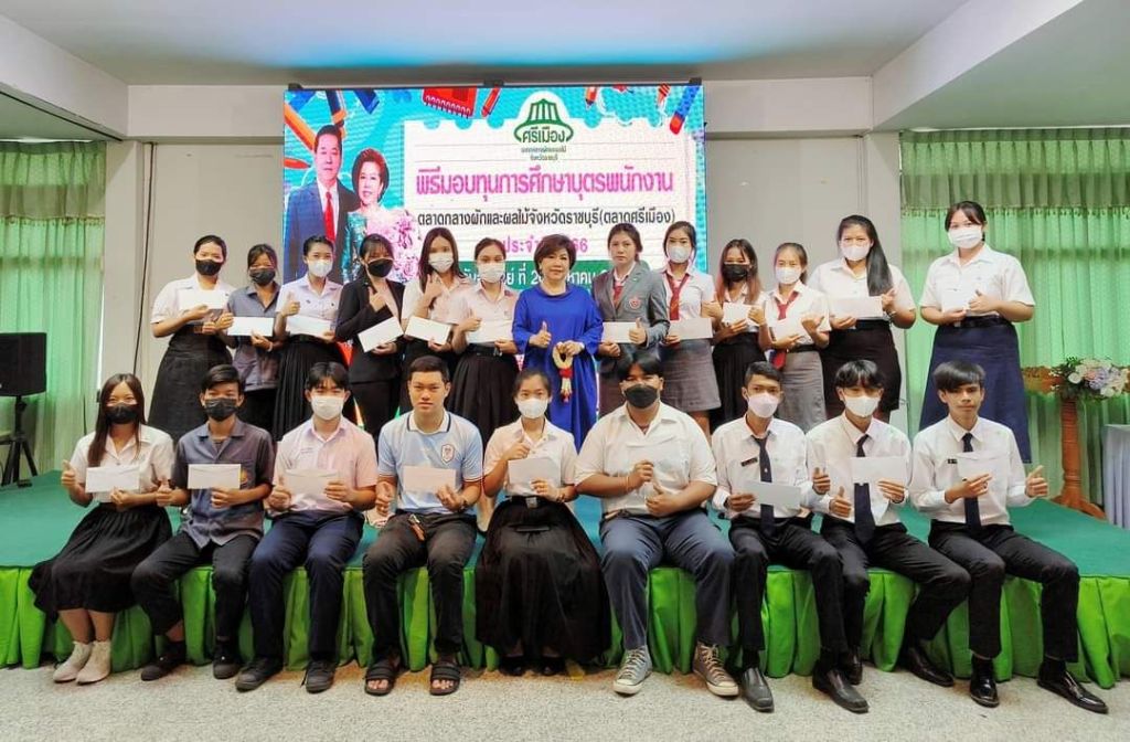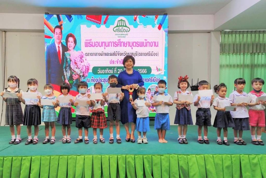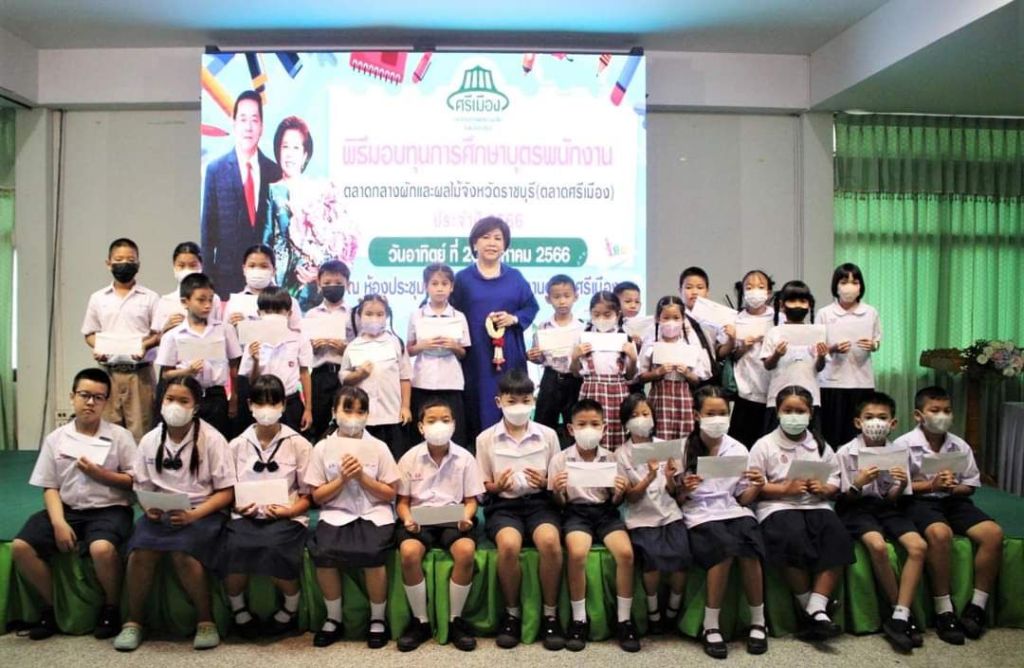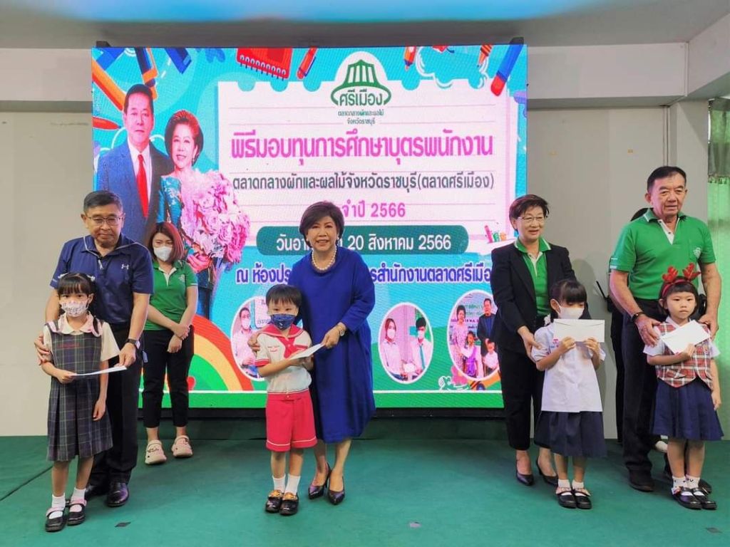 ที่สำนักงานตลาดศรีเมือง นางวีณา ศรีสรรพางค์ รองประธานกรรมการบริหารตลาดศรีเมือง อ.เมือง จ.ราชบุรี เป็นประธานมอบทุนการศึกษาแก่บุตรพนักงานตลาดศรีเมือง ประจำปี 2566 ณ ห้องประชุมชั้น 3 สำนักงานศรีเมือง
