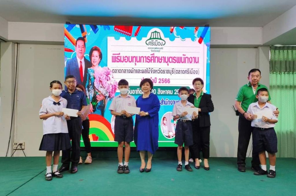 สำหรับการมอบทุนดังกล่าวเป็นความประสงค์ของคุณนภินทร – คุณวีณา ศรีสรรพางค์ ประธานกรรมการบริหารตลาดศรีเมือง และครอบครัว ที่ต้องการสร้างขวัญกำลังใจ ลดภาระค่าใช้จ่ายให้แก่พนักงาน รวมทั้งส่งเสริมสนับสนุนการศึกษาแก่บุตรพนักงาน จำนวน 108 ทุน โดยแบ่งเป็นระดับชั้นอนุบาลถึงระดับปริญญาตรี เป็นเงินทั้งสิ้น 176,500 บาท